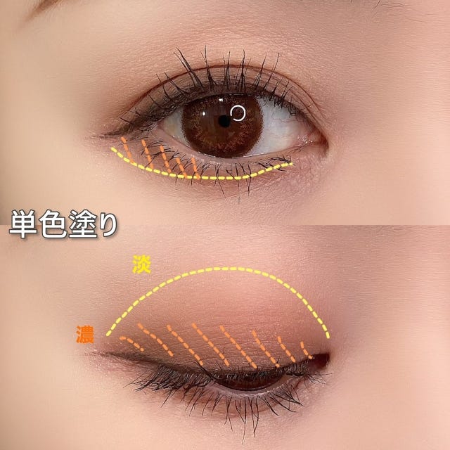 単色でも立体感を出したい場合は、目のキワに重ねて濃さを出すことでグラデーションを作れます。