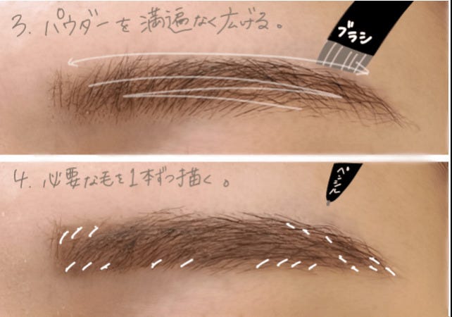 眉頭、眉尻の必要な毛を描き、眉の輪郭も足りない部分は足しましょう。