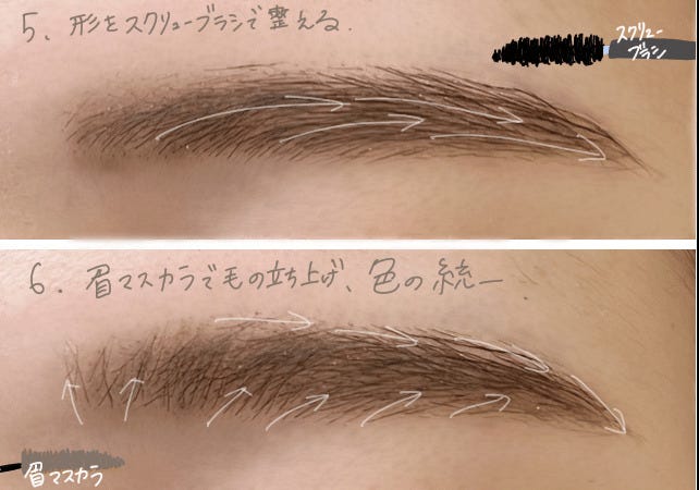 眉マスカラ等を使って、眉頭の毛を上にむけてあげることより自然な仕上がりになります。