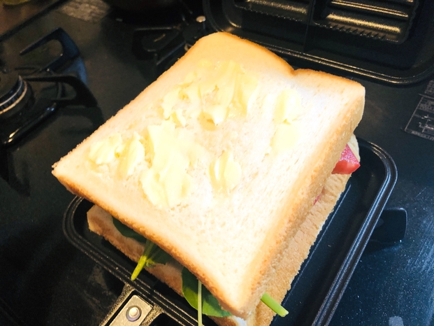 パンの片面にバターを塗り、塗った面を下にしてホットサンドメーカーに乗せます。