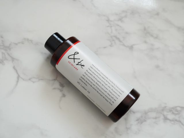 ここで使っている化粧水は、美容液のようにリッチなテクスチャーの&be「VCローション10」(100ml 税込4,180円)。保湿型ビタミンC誘導体を10%配合した高保湿化粧水で、毛穴ケアやエイジングケアをしたい方にもぴったりのアイテムです。