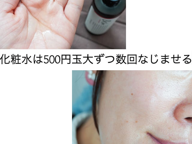 化粧水を塗るときは、数回に分けて塗ってみてください。手のひらに500円玉大を出し、顔全体にやさしくなじませて、うるおい具合を確かめます。足りないようであれば同量を再度塗布し、肌が満足感を覚えるまで繰り返します。