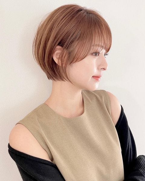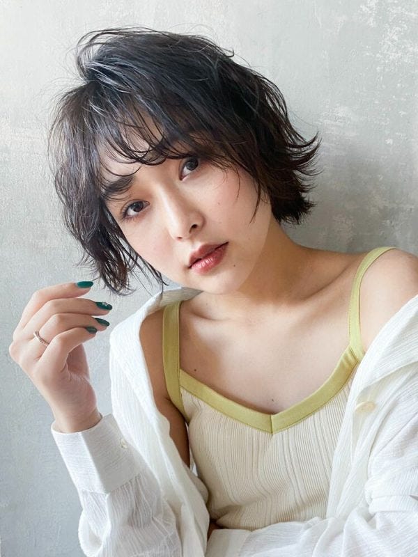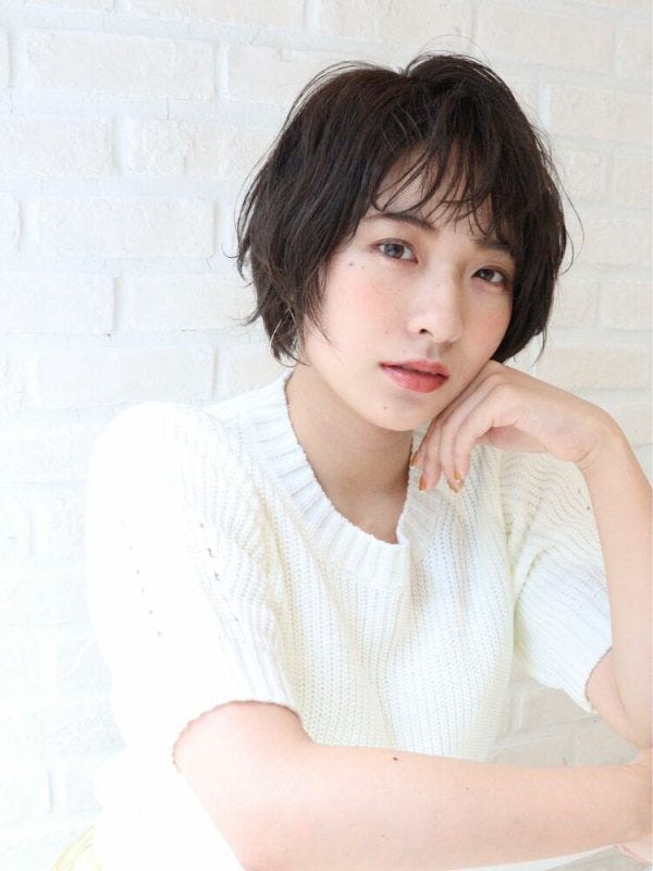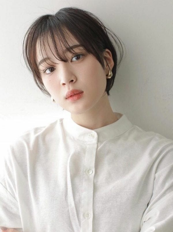 髪を程よく梳いて隙間を作り軽やかにすれば柔らかく大人っぽい雰囲気に。暗髪の前髪ありショートでも子供っぽくなりにくい髪型です。
