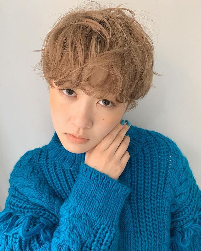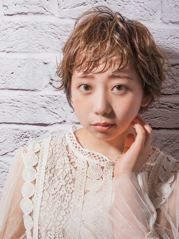 オン眉ショートに、ふんわり柔らかいパーマと明るめのヘアカラーでエンジェルっぽいショートにすれば丸顔さんの魅力が引き立ちます。