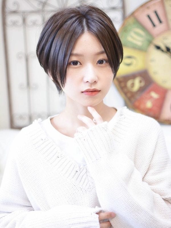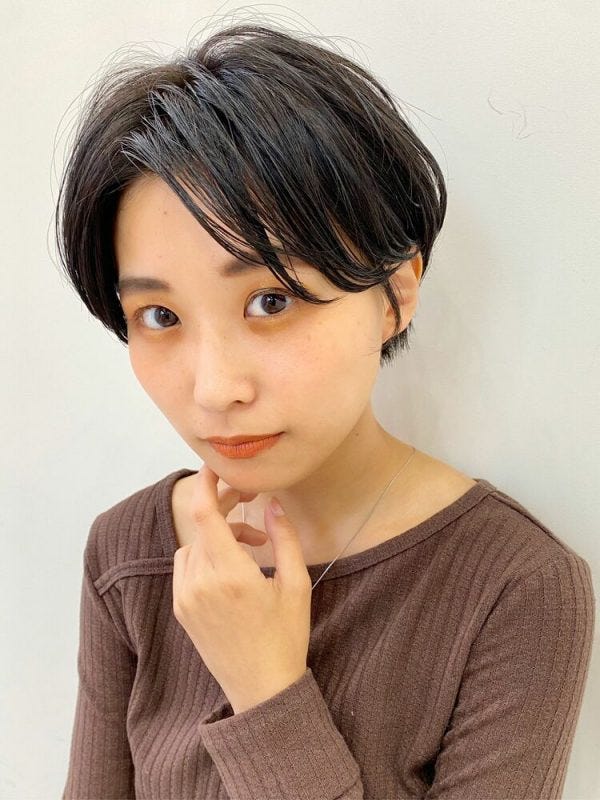 暗髪と相性がよく、大人っぽい落ち着いた雰囲気が演出できる髪型です。襟足が長めで、おでこからの縦ラインが強調されるので丸顔さんに似合うショートですよ。
