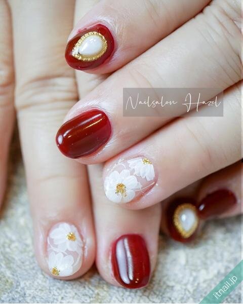 例えば、レッドベースのネイルに、ゴールドのメタルフレームとしずく型のパーツを使ってブローチモチーフをアートするデザインはいかがでしょうか。まるでジュエリーを付けたかのような、エレガントでゴージャスなネイルを楽しめます。