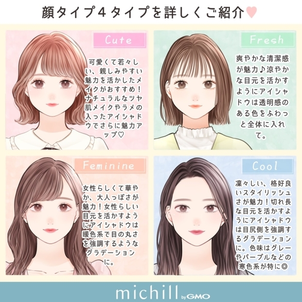 診断によってキュート・フレッシュ・フェミニン・クールの4つの顔タイプに分けられます。