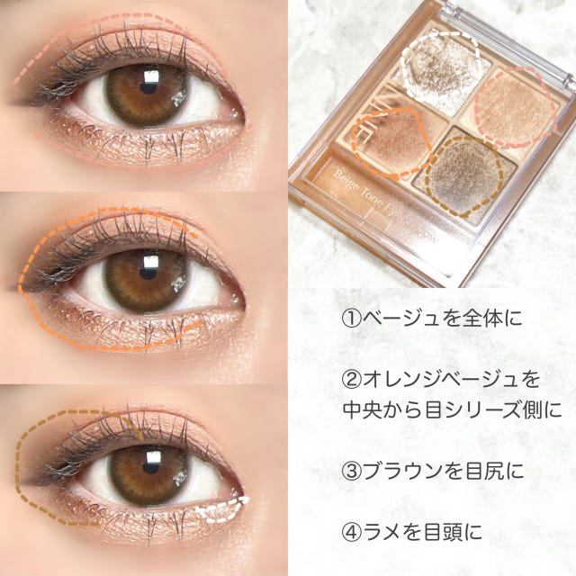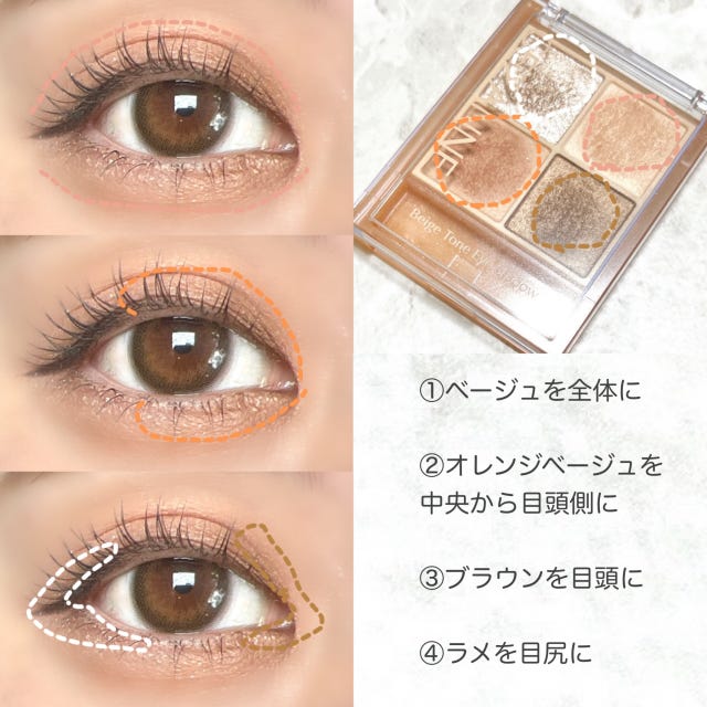 同じベージュトーンで構成されたパレットだから、重ねるだけで簡単に綺麗なグラデーションを作ることができますよ。