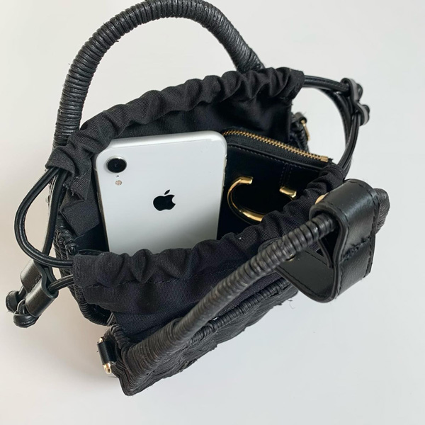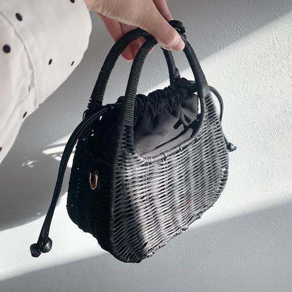 ラタン素材と、巾着の紐やショルダーストラップなどに使用されたフェイクレザーが相まって、高見え感を演出。