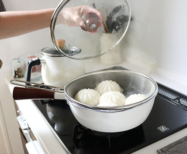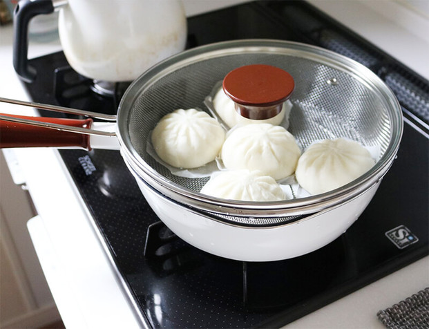 冷凍食品のあんまん、肉まんもたっぷりの蒸気で蒸せば、フッカフカの仕上がりに。