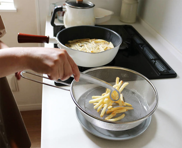 フライパン全体を使う大きめザルは、家族全員分の蒸し物も可能。