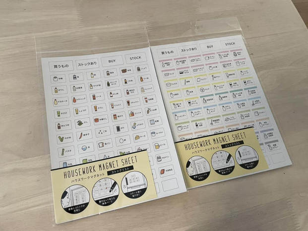 開封してみると薄いマグネットシートで取り外しも簡単。たくさんの生活必需品のイラストと名前が書かれていて、中には「寝ぐせ直し」や「排水口ネット」なども!本当に一般家庭で必要な細かいところまで網羅しているな、と感じました。