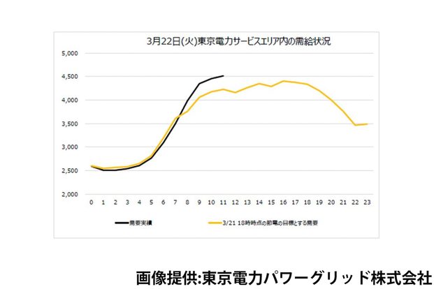 「弊社の公式ツイッターで東京電力サービスエリア内の需給状況を発表しております。黒い折れ線グラフがお客様が使用されている電力、黄色のグラフが節電目標の数値になります。黄色のグラフで書かれた数値が望ましいのですが、数値は上振れしています」(東京電力パワーグリッド広報担当者)。たしかに、12時時点で4,000目標だったのに対して、需要は4,500を記録している。