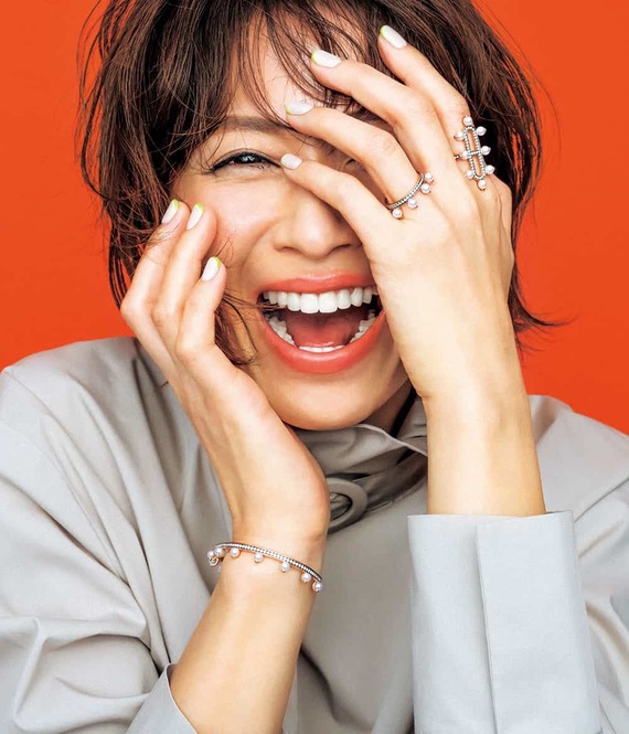ブレスレット「エルメス・シャンドラ」〈DIA ×アコヤ パール× PG〉¥2,288,000(予定価格) 薬指リング「エルメス・シャンドラ」〈DIA ×アコヤ パール× PG〉¥1,040,600(予定価格)人さし指リング「エルメス・シャンドラ」〈DIA ×ア コヤパール× PG〉¥1,221,000(予定価格)(すべてエルメス/エルメスジャポン)ブラウス¥37,400(アドーア)
