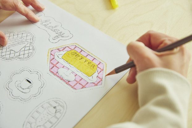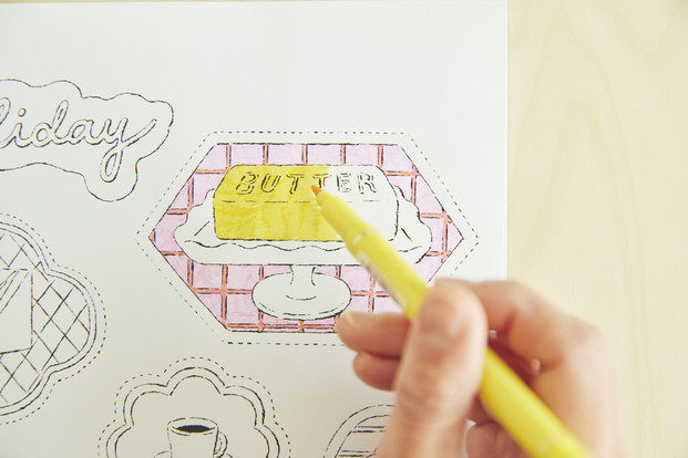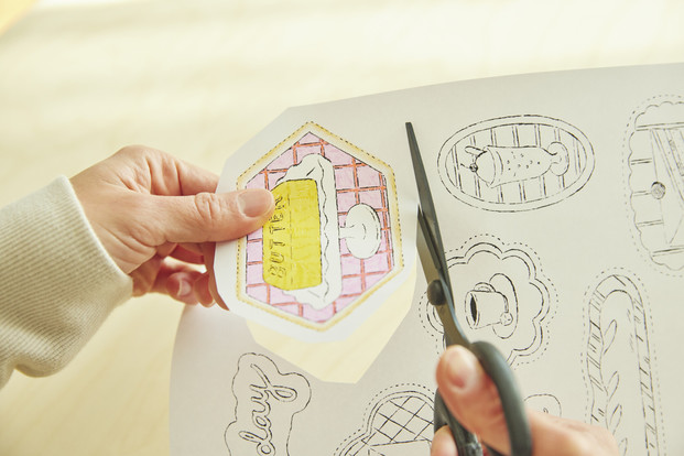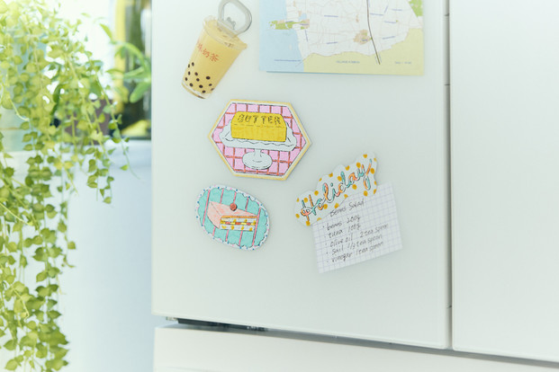 喫茶店モチーフの塗り絵を楽しんだら、マグネットを作っていろんなところにペタッ!冷蔵庫にメモを貼るのにも役立ちます。