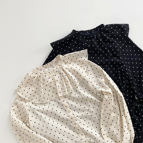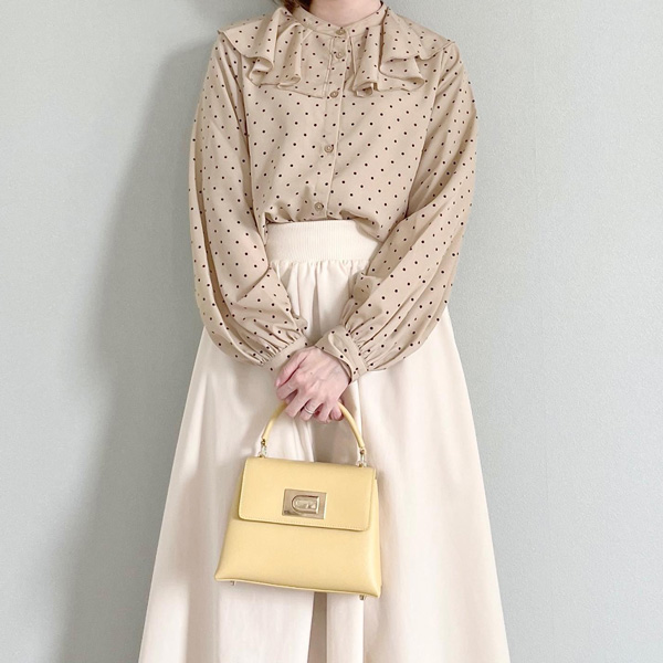 絶妙な大きさのケープカラーがポイントの、甘くなりすぎない、春にぴったりなドット柄ブラウスです。