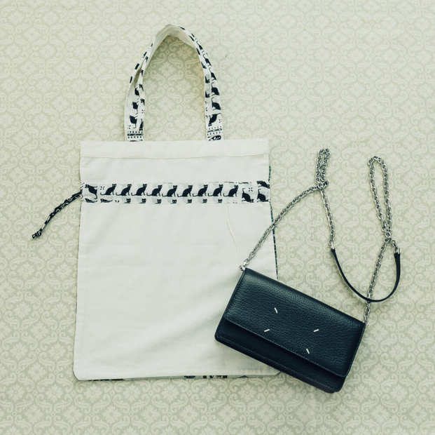 「トートはリバーシブルだから、コーデに合わせて柄を変えられるし、巾着のように絞ってフォルムをチェンジできるのがお気に入り。仕事に必要なアイテムを入れています。マルジェラのバッグはお財布代わりとして使えて、カードやリップなどすぐに取り出したいものをイン。プライベートでも活躍しています」