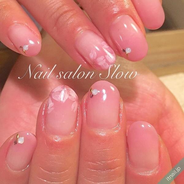 ぷるんとしたピンクのグラデーションにホワイトで桜を描き、可憐なイメージに。乗せているラインストーンも、ホワイトオパールという控えめな光り方をするカラーを選んでいて、悪目立ちしません。グラデーションは爪が伸びてきたときも根元が気になりにくいため、早く伸びる方には特にオススメ。