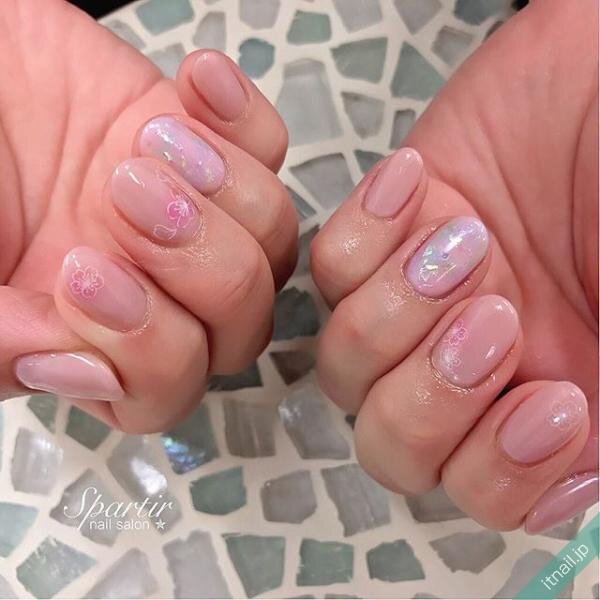 ピンクベージュのワンカラーをベースに塗り、桜をちょこんと乗せて可愛らしい雰囲気に。薬指のニュアンスアートもポイントとなっていて、程よく華やかさがプラスされています。パーツなどはないので、フラットな仕上がりがお好きな方に向いています。