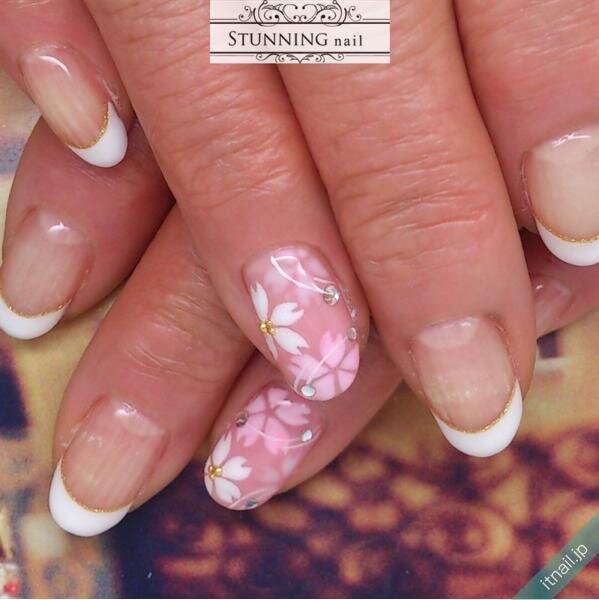 定番の白フレンチに桜をミックスして、清楚なイメージに。シンプルだからこそ、繊細なタッチのアートがより活かされています。フレンチの境目にあるゴールドのラメラインを細めにしているのもポイント。上品で素敵に仕上がります。
