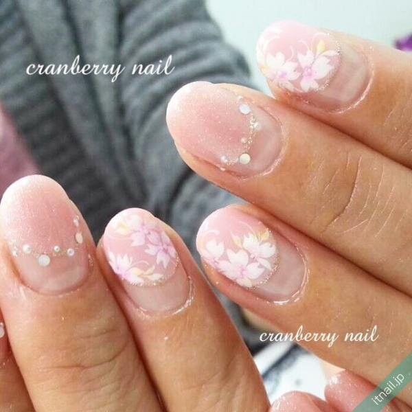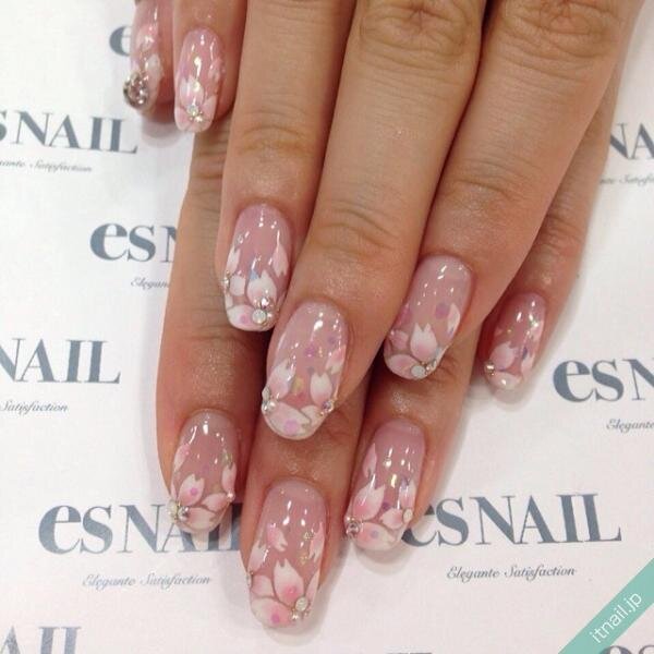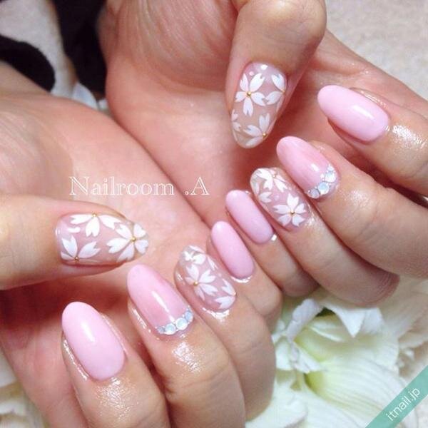パステルピンク×桜でキュートな仕上がりに。ラインストーンもやさしい色味のホワイトオパールを使っていて、上手くまとめられています。クリアベースに桜を描くと、さわやかさがプラスされます。