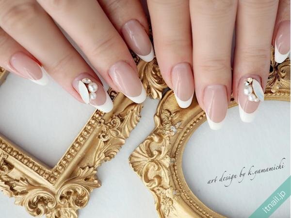 清潔感あふれる白×ベージュのフレンチネイルは、ビジューとの相性もばっちりです!