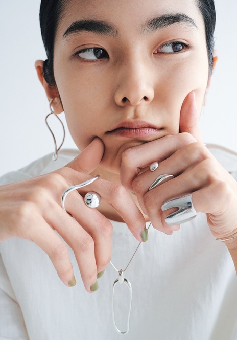コールムーンのアトリエがあるのは、昔ながらの町工場や問屋が多く残る東京都台東区。工程において、地場の職人や工場と共に上質なジュエリーを製作。地場産業の活性化への貢献や、輸送時のCO2排出の削減に積極的に取り組んでいる。ジュエリーに使われているメインの素材は、再利用可能なシルバー。クールな素材感が映え、シンプルで無駄がなく、それでいて独創的なデザインは、大地に刻まれた石の形や、真夜中の海の上で輝きを放つ月など、自然やそれらが織りなす情景からインスパイアされたもの。その独特のフォルムは人の体の曲線や動きに寄り添い、身につける人に、しなやかな強さをもたらしてくれる。また、長く愛用できるようにメンテナンスや修理も受け付けている。Voidイヤーカフ¥37,400 Hamonネックレス¥36,300 〈右手〉Moon&Oceanリング¥46,200 〈左手〉中指・Oboroリング¥33,000 小指・Slitリング¥50,600(コールムーン www.call-moon.com)
