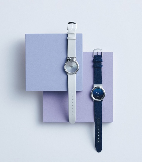 地球の美しさや自然の神秘にインスピレーションを受けた、“シチズン エル”シリーズのサステナブルな腕時計。バンドにはペットボトルなどをリサイクルして生まれた繊維を、電池は太陽光や室内のわずかな光を電気に換えるエコ・ドライブを採用。シンプルなフェイスは、12時の位置に配した天然ダイヤモンドと同じ硬さ、輝きを持つエシカルなラボグロウン・ダイヤモンドが輝くアクセントになっている。リストウォッチ 各¥42,900(シチズン エル/シチズンお客様時計相談室 TEL:0120・78・4807)