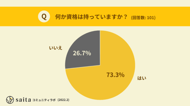 saitaコミュニティラボで「何か資格を持っていますか?」とアンケートを行ったところ、「はい」と答えた人が73.3%と多いことがわかりました。