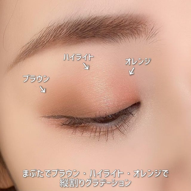 オレンジ、ブラウン、ハイライトの3色を縦割りにまぶたに塗った、見る角度によって雰囲気が違うオシャレアイメイクです。