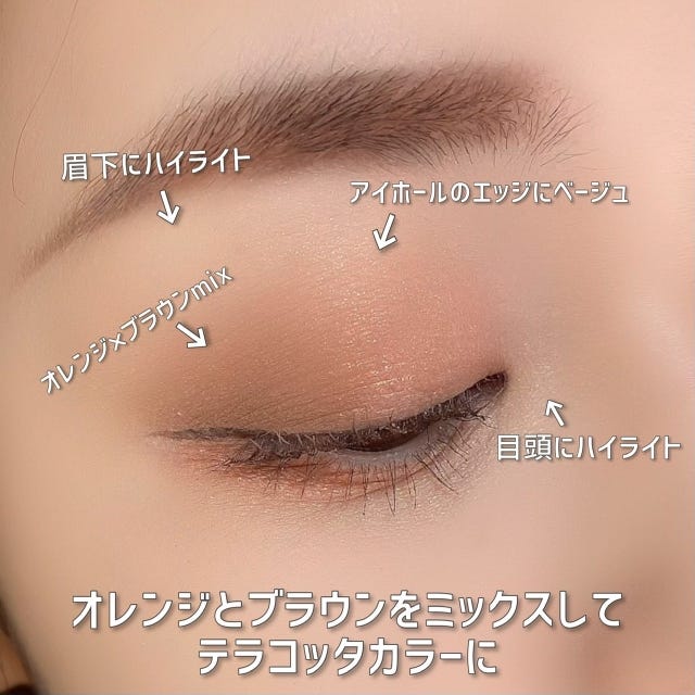 ポイントカラーのオレンジを単色で使うだけで完成するアイメイクです。