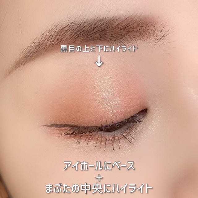 黒目の上と下に光が入るように、ハイライトカラーをしっかり入れたアイメイクです。まぶたの真ん中に光が入ることでツヤ感と立体感がでます。