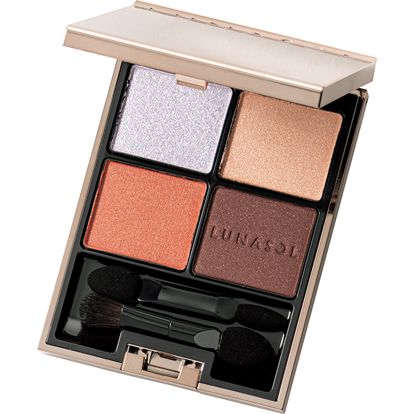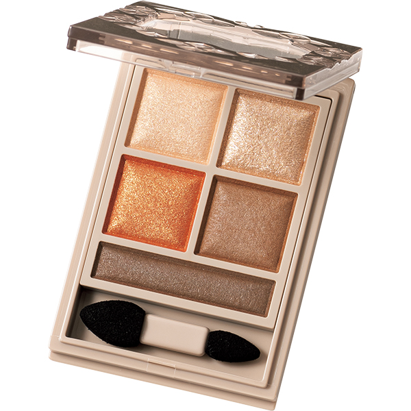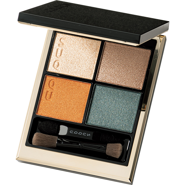 締めすぎない淡いブラウンと明るいオレンジはくぼみ解消に最適。肌馴染み抜群のゴールドラメも大人に嬉しい。スック シグニチャーカラーアイズ 08 ¥7,700(SUQQU)