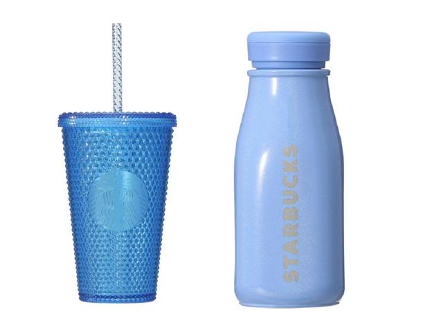 ブルー系のグッズは、「ロゴコールドカップタンブラーバンピーブルー473ml」(2300円)、「ステンレスミニボトルブルー237ml」(3520円)、「耐熱グラスマグブルー355ml」(2530円)、「リユーザブルストロー&シリコーンケース」(990円)。