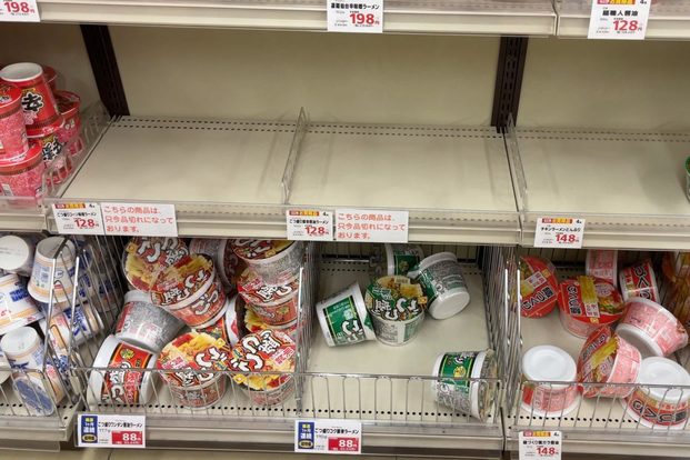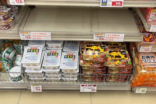 特に、品切れが多かったのが、カップ麺コーナー。「ごつ盛りコーン味噌ラーメン」、「ごつ盛り豚骨醤油ラーメン」、さらに「ごつ盛りソース焼きそば」が棚からなくなっていた。