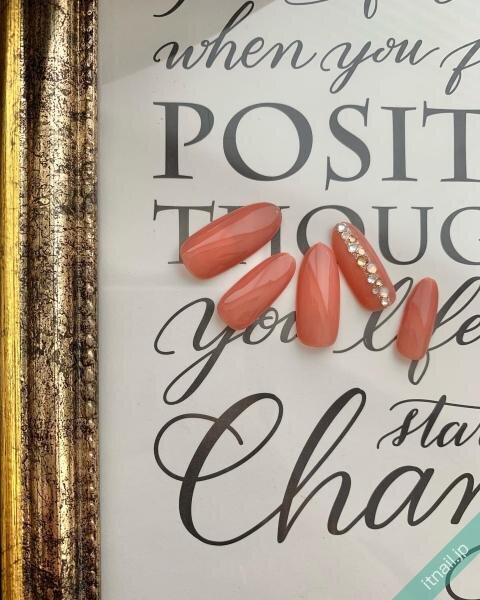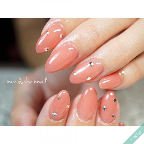 コーラルネイルだけでも大人可愛く決まりますが、物足りないときはストーンをプラスしてみて♡ランダムに置くだけで指先の輝きが増し、特別感のあるコーラルネイルになります。春はドット柄にするように配置するのもおすすめ!
