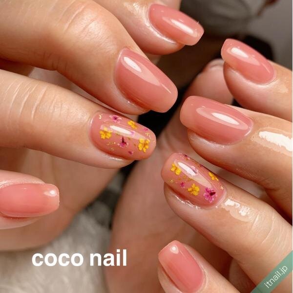 コーラルカラーは、フラワーネイルとの相性も抜群です。春に取り入れたいデザインとして大人気♡シンプルに押し花を散らすだけで、お花畑にいるような可愛い春ネイルになりますよ。