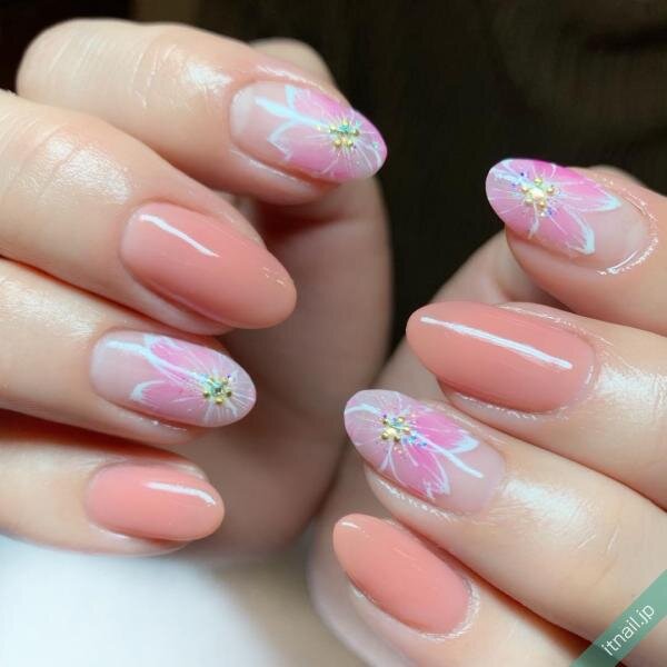 コーラルカラーをベースに、手描きフラワーをワンポイントに入れるのもおすすめ♡春なら、桜を描いたデザインが人気です。コーラルカラーも少しピンク味を強くしてあげると、柔らかさが増してより可愛くなるので調節してみてくださいね!