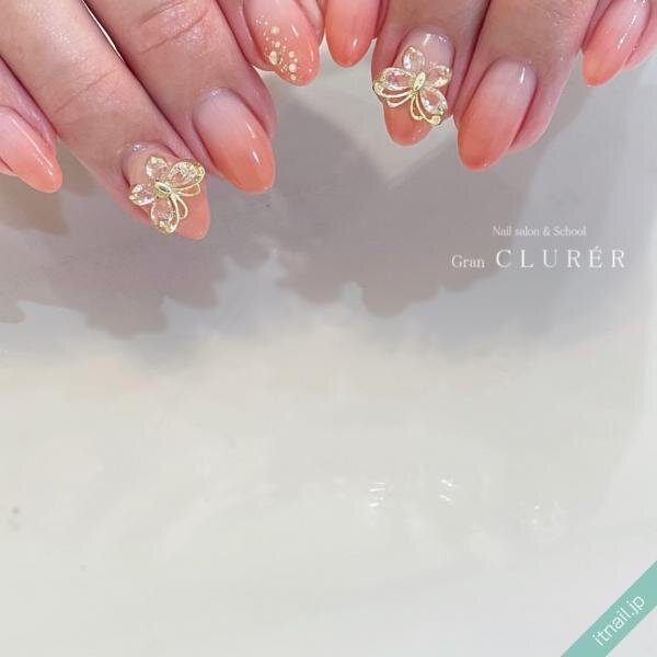 人気のバタフライパーツをのせて、春らしい軽やかなネイルを楽しむのもおすすめ♡ベースにしたコーラルカラーのグラデーションが、蝶々の可愛らしさを引き立ててくれているようですね!何度も指先を見たくなるデザインです。