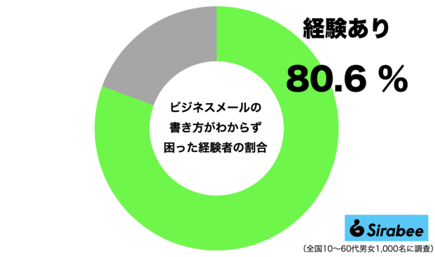 編集部が全国10〜60代の男女1,000名を対象に調査したところ、全体の80.6%が「ビジネスメールの書き方がわからず困った経験がある」と回答。