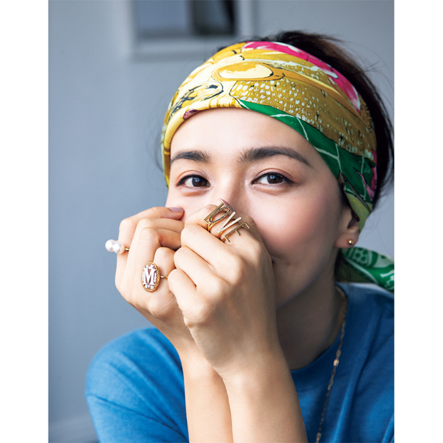 リング【左手】「L」[K18YG]¥85,800「O」[K18YG×ブラックDIA]¥147,400「V」[K18YG×DIA]¥180,400「E」[K18YG]¥94,600【右手】(人差し指)[K18YG×淡水パール]¥101,750(小指)[K18YG×シェル]¥407,000 シングルピアス[K18YG]¥11,000 ネックレス(チェーン)[K18YG]¥114,400(すべてビジュードエム/ビジュードエム ギンザシックス)ニット¥47,300(イレーヴ)スカーフ¥13,200(マニプリ)