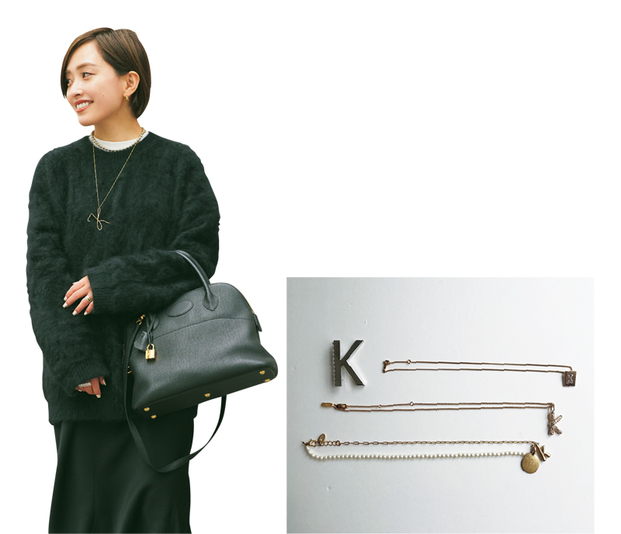 イニシャルモチーフが大好き。「K」の一文字があるだけでシンプルコーデが自分らしくなる気がします。着用しているシーズマーラのネックレスは筆記体がめずらしく、重ねづけもしやすそうで購入。ネックレスは上からセリーヌ、クロエ、ZARA、ブローチはステラハリウッドのもの。