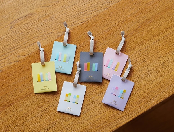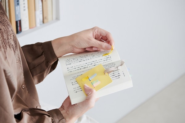 一見、しおりのように見えるこのふせん。実際しおりとしても使えるのですが、その中にフィルムふせんが収納されているんです。ふせんのケースがしおりになっている、というべきでしょうか。