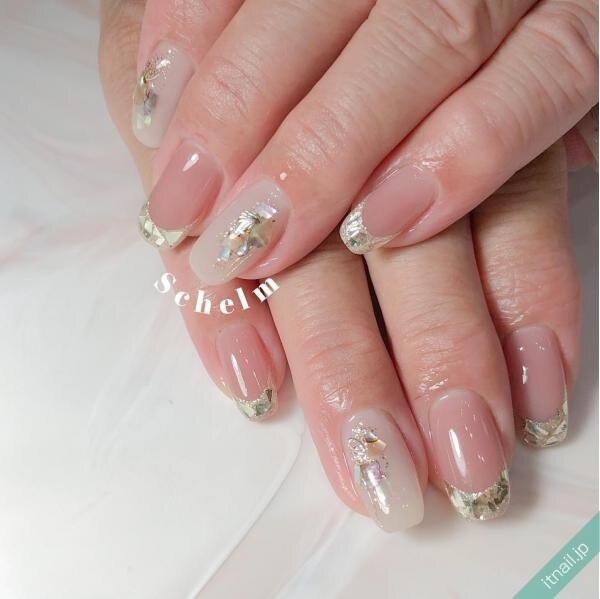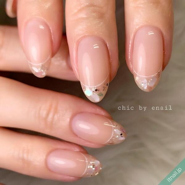 シェルだけでなく、ラメやホログラムを使って、大人気のガラスフレンチネイルにするのもいいですね♪スキンカラーに入れるだけで、エレガントなキレイめネイルにすることができます。華やかなネイルにしたいときにぴったり!