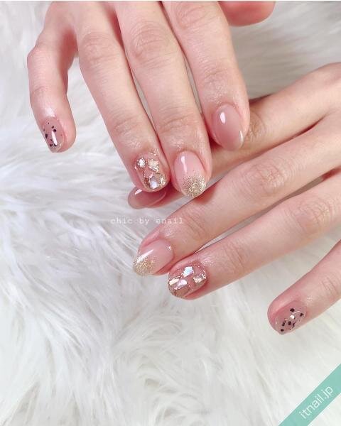 色のグラデーションも素敵ですが、シェルを使ったグラデーションもおしゃれ♡爪の先端にシェルやラメをたっぷりのせて、根元側に向かうほど少なくしてみてください。透け感のあるスキンカラーをベースにするのがおすすめです。