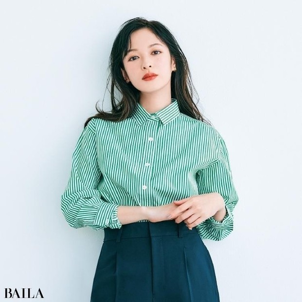 トレンドのグリーンはストライプで差を。ほどよくハリ感のある素材がオフィスコーデに最適。ルーズすぎずタイトすぎない、ジャストなサイズ感も“きれい見え”につながる重要ポイント。