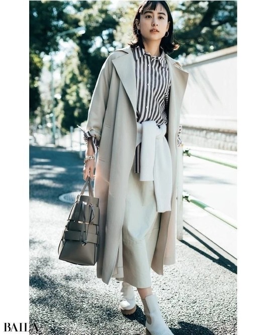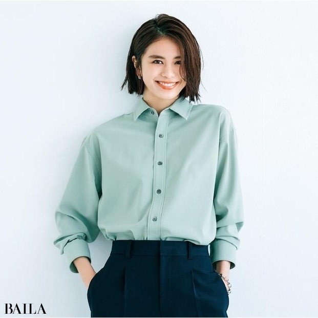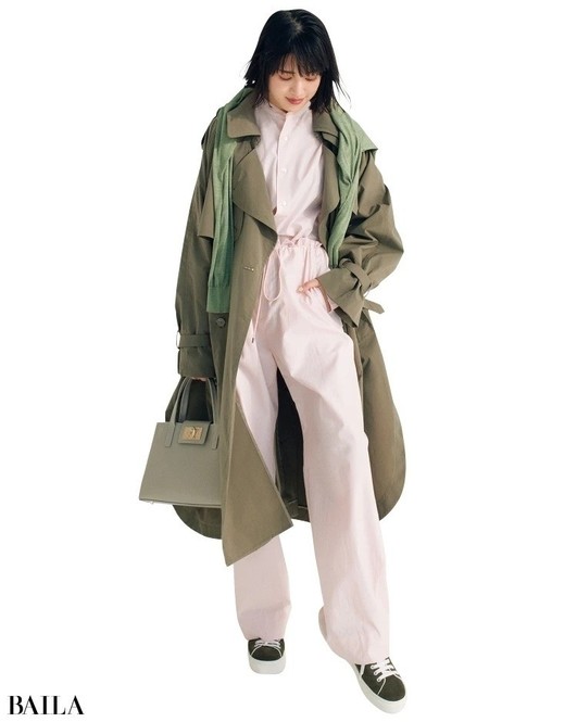 やわらかな体のラインに優しく寄り添う、ソフトで落ち感のある素材。ややコンパクトなシルエットだからルーズな印象にならない。彩度の高すぎないグリーンが大人に似合う。