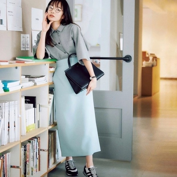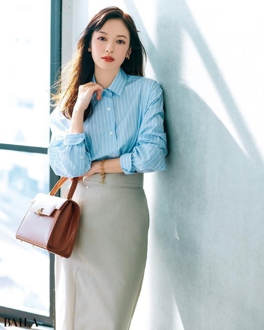 パリッとしたコットン生地×知的なストライプで洗練感アップ。シャツで縦のラインを印象づければボリューミーな体型もほっそりスマートに。ブルーと白のまじめな配色はカーヴィなタイトスカートで女っぽくアレンジ。