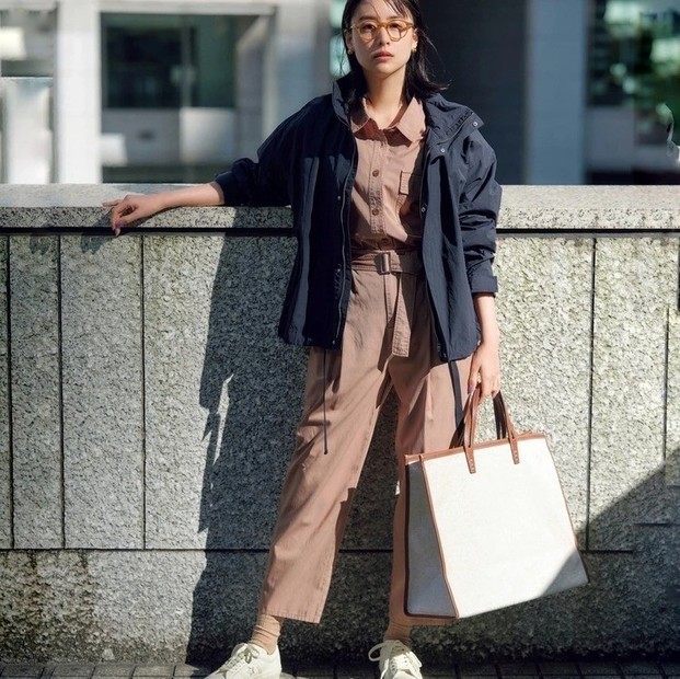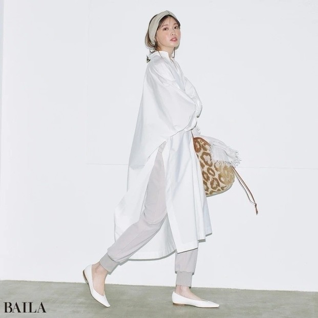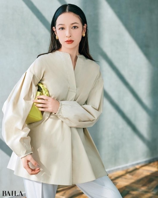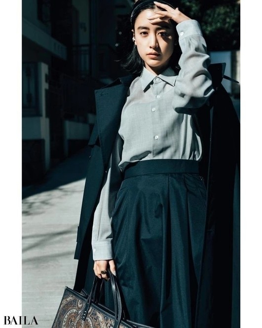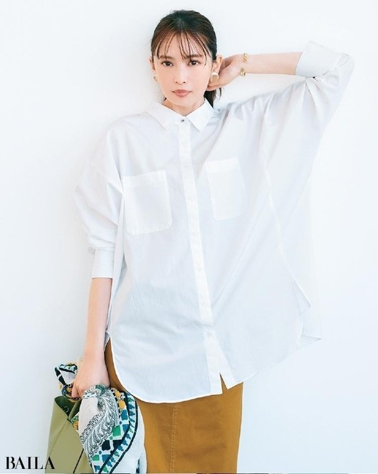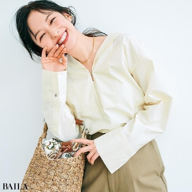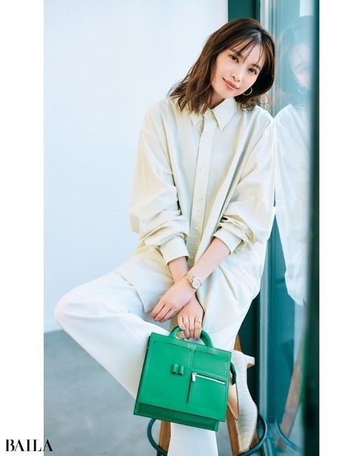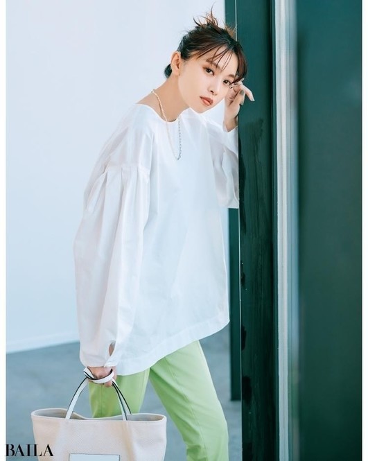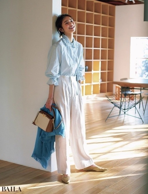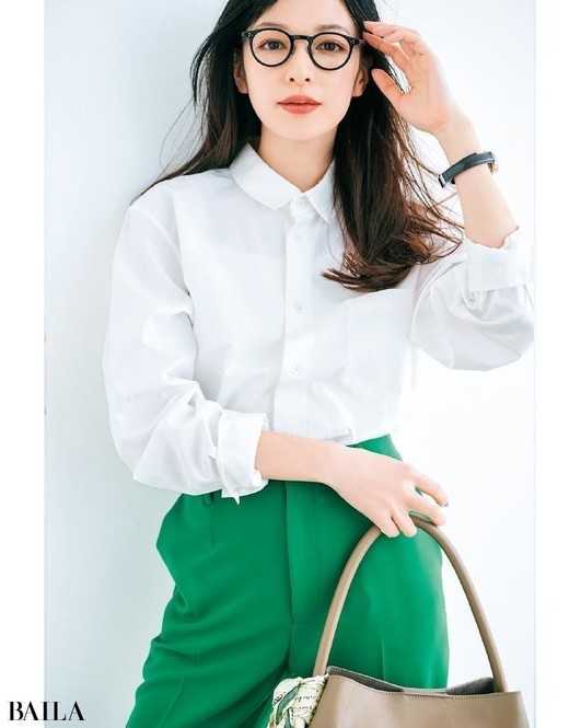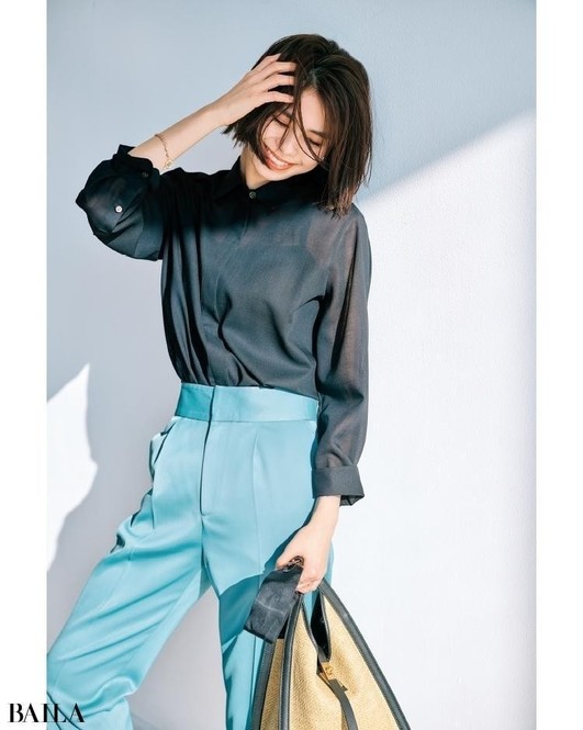 シャツ¥16500/メゾン イエナ(イエナ) パンツ¥17600/ユナイテッドアローズ 有楽町店(ユナイテッドアローズ) イヤリング¥6300/アビステ リング¥12100/ココシュニック バッグ¥36300/ジャンニ キアリーニ 銀座店(ジャンニ キアリーニ)