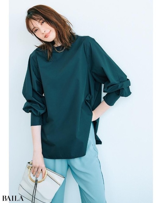 春気分が高まるサックスブルー。縦にあいた直線的なネックラインが顔から首元をすっきり見せてくれる。やや丈長めのシルエットをウエストアウトで着てこなれ感を。
